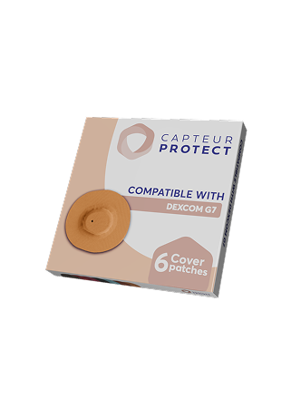 Adesivo protetor para o sensor de glicemia Dexcom® G7, projetado para conforto, discrição e prolongar a vida útil do dispositivo. Os adesivos Capteur Protect, certificados como dispositivos médicos, garantem fixação segura e uso de materiais hipoalergénicos e respiráveis que preservam a saúde da pele.