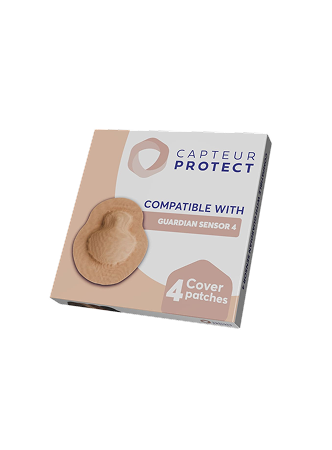 Adesivo protetor para o sensor de glicemia Guardian™ 4, da Capteur Protect, projetado para conforto, discrição e prolongar a vida útil do dispositivo. Os adesivos, certificados como dispositivos médicos, garantem fixação segura e utilizam materiais hipoalergénicos e respiráveis que preservam a saúde da pele.